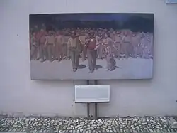 Im Zentrum und Vordergrund sind drei auf dem Originalgemälde lebensgroß dargestellte Personen (zwei entschlossen wirkende Männer und eine in klagender Mimik seitlich herbeitretende, vom Hochrenaissance-Maler Raffael inspirierte madonnenhaft erscheinende Frau mit männlichem Kleinkind auf dem Arm) als hervorstechende bzw. anführende Einzelpersonen mit individuellen Zügen zu erkennen; wohingegen die einzelnen Menschen der unmittelbar dahinter folgenden Menge oft nur schemenhaft erscheinen – sozusagen noch in der Anonymität der Masse verborgen und mit ihr verschmelzend.