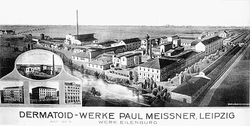 Meißner war ein in Leipzig ansässiger Unternehmer. Sein Vater hatte dort 1842 eine Fabrik zur Herstellung von künstlichem Dünger und Futtermittel gegründet. Ab 1899 trug die Firma den Namen Dermatoid-Werke Paul Meißner und wurde in eine Aktiengesellschaft umgewandelt. Der Unternehmenssitz wechselte nach Leipzig. Grund dafür war neben den familiären Wurzeln die Bedeutung Leipzigs als Handels- und Messeplatz. Die Produktion blieb in Eilenburg und wurde weiter ausgebaut. So entstand 1904 eine eigene Celluloid-Fabrik, die 1912/13 erweitert wurde.[4] Während des Ersten Weltkrieges lieferten die Dermatoid-Werke Schießbaumwolle für die Rüstungsindustrie. 1926 übernahm der Sohn Arthur Meißner († 1972) die Firmenleitung. In den 1930er-Jahren ließ sich das Unternehmen weitere Produkte auf Basis der hergestellten Kollodiumwolle patentieren, was eine Betriebserweiterung nach sich zog. Mit Beginn des Zweiten Weltkrieges mussten die Dermatoid-Werke die Produktion wieder auf Schießbaumwolle umstellen. Bis zu 30 Fremdarbeiter waren während dieser Zeit in der Produktion beschäftigt. Beim Beschuss Eilenburgs im April 1945 erhielt das Werke mehr als einhundert Granateinschläge der amerikanischen Artillerie. Unmittelbar nach Kriegsende wurden Teile der beschädigten Anlagen notdürftig repariert. Zu einer Betriebsaufnahme kam es jedoch nicht, da das Werk als Großlieferant der deutschen Rüstungsindustrie zur Demontage vorgesehen wurde. So verließen bis Ende 1945 etwa 120 Eisenbahnwaggons mit dem gesamten noch nutzbaren Maschinenpark das Werksgelände in die Sowjetunion. Die zur Demontage abgestellten Sowjetsoldaten entdeckten dabei den unterirdisch lagernden Industriealkohol. Wohl mehr als zehn von ihnen vergifteten sich durch den Genuss des vergällten Alkohols und starben. Sie wurden in der OdF-Gedenkstätte auf dem Eilenburger Ostfriedhof beigesetzt.
