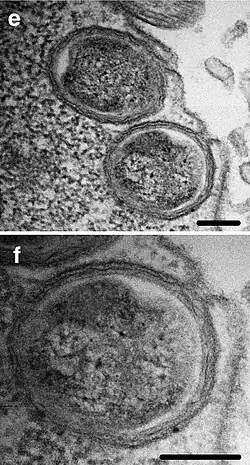 TEM-Aufnahmen von „Ca. D. trichonymphae“ Rs-N31, einem Ektosymbionten von Trichonympha collaris (Parabasalia) im Verdauungstrakt der Termite Zootermopsis nevadensis. | ||||||||||||