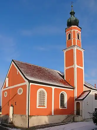 Bei dieser Saalkirche handelt es sich um eine spätgotische Anlage, deren Bau um 1444 vom Erbmarschall in Bayern Caspar I. Pfäffinger[14] und seiner Frau Elisabeth Pfaffinger[14] begonnen wurde. Der Kuppelturm und die angebaute Sakristei sind barocken Stils. Wohl um 1730 wurde das Innere der Kirche barockisiert. Der Hochaltar datiert aus dieser Zeit.[15] Er stellt mit der Szene einer Himmelserscheinung vor den Toren Damaskus die Bekehrung des Christenverfolgers Saulus dar und ferfügt über eine figurenreiche spätgotische Schreingruppe.[14] Sie ist gegliedert durch Lisenen und Dachfries am Chor.