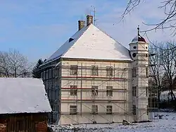 Bei dem Gebäude handelt es sich um einen Spätrenaissancebau, der Anfang des 17. Jahrhunderts errichtet wurde. Das Schloss ist dreistöckig und wurde in Rechteckform mit Walmdach ausgeführt. Die Südseite zeichnen zwei kleine runde Ecktürme aus mit einem achteckigen Oberbau.[15] Die flankierenden Nebengebäude wurden eingeschossig aus Ziegelstein mit Satteldach errichtet. Ebenso aus Ziegelstein mit Satteldach wurden die erhaltenen Gebäude des ehemaligen dreiflügeligen Wirtschaftshofs (Nord- und Ostflügel) gebaut. Nebengebäude wie Wirtschaftshof stammen aus dem 18./19. Jahrhundert.