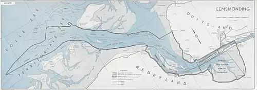 Nach dem Zweiten Weltkrieg gab es ab 1945 Überlegungen in den Niederlanden, große Gebietsteile entlang der deutsch-niederländischen Grenze zu annektieren. In Ostfriesland umfasste dies die „Emsmündung vom Ausgang des Dollarts bis zur offenen See beiderseits Borkums, die Insel Borkum, den Küstenstreifen auf dem deutschen Ufer von der Knock bis Pilsum, den bisher deutschen Teil des Dollarts und das Rheiderland“.[7] Mit diesem Vorhaben scheiterten die Niederlande jedoch vor der Alliierten Hohen Kommission. Im Pariser Sechs-Mächte-Abkommen vom 22. März 1949 war den Niederlanden die Verwaltung der Gebiete von Selfkant (mit mehreren Ortschaften) und Elten sowie von weiteren kleineren Gebietsstreifen entlang der deutsch-niederländischen Grenze nach dem Stand vom 31. Dezember 1937 bis zum Abschluss eines Friedensvertrages übertragen worden. Die Bundesregierung hatte sich seit 1950 um die Rückgabe dieser Gebiete und der Traktatländereien bemüht. Bei letzteren handelte es sich um größtenteils ererbten Grundbesitz von deutschen Bauern auf niederländischer Seite, somit landwirtschaftlich genutzte Flächen zu beiden Seiten der deutsch-niederländischen Grenze, deren Nutzung durch die Verträge der Niederlande mit Preußen von 1816 (Vertrag von Kleve) und mit Hannover von 1824 (Traktat von Meppen) geregelt worden war. Die auf niederländischem Gebiet gelegenen Ländereien deutscher Eigentümer waren nach dem Kriegsende wie das übrige deutsche Vermögen als Feindvermögen auf den niederländischen Staat übertragen und zum Teil wieder verkauft worden, während die niederländischen Bauern ihre Traktatrechte auf ihren im deutschen Grenzgebiet liegenden Ländereien weiterhin ausübten.[8][9] Am 5. April 1957 begannen in Bonn die deutsch-niederländischen Ausgleichsverhandlungen über Grenzfragen, Kriegsfolgen (beispielsweise Reparationen) und andere Probleme. Sie mündeten in den am 8. April 1960 geschlossenen Vertrag zwischen der Bundesrepublik Deutschland und dem Königreich der Niederlande zur Regelung von Grenzfragen und anderen zwischen beiden Ländern bestehenden Problemen (Ausgleichsvertrag).[10] In einem Teil dieses Vertragswerks, dem Vertrag zwischen der Bundesrepublik Deutschland und dem Königreich der Niederlande über die Regelung der Zusammenarbeit in der Emsmündung,[11] behielten sich beide Staaten ihre Rechtsstandpunkte über den Verlauf der Staatsgrenze ausdrücklich vor. Im Artikel 46 Absatz 1 heißt es: