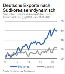 2011 trat das Handelsabkommen zwischen der Europäischen Union und Korea in Kraft. Der Handel beider Seiten stieg in dem ersten sechs Monaten um 3,9 %. Als der größte Handelspartner Koreas in Europa sind deutsche Exporte nach Südkorea im Vergleich mit 2011 im ersten Halbjahr 2015 um mehr als 50 % gestiegen. Durch den Abbau der Zölle sowie die nicht-tariflichen Handelshemmnisse übertrafen im 1. Halbjahr 2015 die Exporte der Automobilbranche nach Südkorea den Wert des 1. Halbjahres 2011 um 159 %. Vorher war Südkorea für die deutschen Autohersteller, aufgrund von nicht-tarifären Handelshemmnissen, ein nur schwer zugänglicher Markt.[15] Auch die anderen Branchen konnten ihre Exporte in Südkorea erhöhen. Insgesamt genießt Deutschland große Vorteile durch das Freihandelsabkommen. Handelsdefizite von Korea mit Deutschland stehen Überschüsse mit mitteleuropäischen Ländern gegenüber.[15]