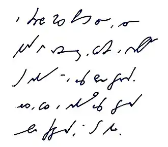 Stenografische Aufzeichnung eines Kolping-Zitats, 2009 in Deutscher Einheitskurzschrift (Verkehrsschrift) geschrieben: „Die Jugend muss froh sein, also gebührt ihr Erholung, welche die Kräfte zur Arbeit und die Lust daran stärkt. Alles, was die Arbeitslust stört oder zerstört, ist von Übel.“