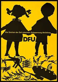 Seit 1972 engagierte sich die DFU stark in einem neuen Thema, nämlich dem Kampf gegen den sogenannten Radikalenerlass. Ihre Vorstandsmitglieder Horst Bethge und Erich Roßmann gehörten zu den Gründern der Initiative Weg mit den Berufsverboten!. Ab Mitte der 1970er Jahre wandte man sich erneut der Abrüstungspolitik zu. Anlass war zunächst die Diskussion über die Neutronenbombe und später vor allem der Beschluss der NATO, Pershing-Raketen und Cruise-Missiles in Europa und speziell auf deutschem Boden aufzustellen, der so genannte NATO-Doppelbeschluss.[39]