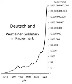Nach der Novemberrevolution 1918 verpflichtete der Friedensvertrag von Versailles 1919 Deutschland zu Reparationszahlungen an die Siegermächte (insbesondere an Frankreich). Deutsche Reparationsleistungen mussten in Goldmark, Devisen und Sachgütern geleistet werden.[5] Im Januar 1920 hatte die Mark gegenüber dem US-Dollar nur noch ein Zehntel ihres Wertes vom August 1914.