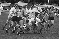 Während des Kalten Krieges unternahm der DRV mehrmals Versuche der Annäherung an den ostdeutschen Rugbysport. Er unterbreitete dem Deutschen Turn- und Sportbund (DTSB), der dem DRSV übergeordnet war, mehrmals das Angebot, Freundschaftsspiele zwischen beiden Nationalmannschaften auszutragen, was der DTSB jedoch stets ablehnte. Nachdem eine gemeinsame Rugbymannschaft von BSG Lok Berlin und BSG Post Berlin 1985 bei einem Turnier in Olomouc gegen den Berliner SC gespielt hatte, verbot der DTSB seinen angeschlossenen Mannschaften die Teilnahme an internationalen Turnieren mit westdeutscher Beteiligung.[35] Im November 1988 wurde der DRV als 38. Nationalverband in den International Rugby Football Board (IRFB; heute World Rugby) aufgenommen, so dass Deutschland ein Jahr später an der Qualifikation zur Weltmeisterschaft 1991 teilnehmen konnte. Bei ihrem einzigen Qualifikationsspiel, das gleichzeitig für den FIRA-Pokal 1989/90 zählte, unterlag die Auswahl des DRV am 17. September 1989 in Heidelberg den Niederlanden mit 6:12 und schied somit aus.[36]