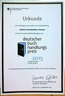 - ↑ Monika Grütters: Rede von Staatsministerin Prof. Monika Grütters MdB / Beauftragte der Bundesregierung für Kultur und Medien / zur erstmaligen Verleihung des „Deutschen Buchhandlungspreises 2015“ am 17. September 2015 in Frankfurt (Main) auf der Seite deutscher-buchhandlungspreis.de