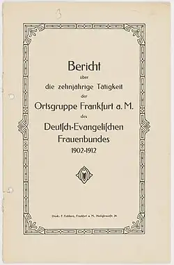 Der Deutsche Evangelische Frauenbund (DEF), bis 1969 Deutsch-Evangelischer Frauenbund (D.E.F.B.), ist eine protestantische Frauenorganisation. Er wurde am 7. Juni 1899 in Kassel gegründet und war innerhalb der christlichen Frauenbewegung die einzige Gruppierung mit eigenständiger Organisationsstruktur und als erster bereits am 18. September 1901 im Vereinsregister eingetragen. Der Sitz ist seither in Hannover.[3] Dem Bundesverband gehören neun Landesverbände mit ca. 100 Ortsverbänden und Anschlussvereinen und ca. 10.000 Mitglieder an.