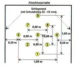 Die Oberfläche im Spielbereich muss stabil, eben, waagerecht und rutschfest sein. Der Spielbereich muss durch 5 cm breite weiße Bodenmarkierungen gekennzeichnet sein (vorne, hinten und seitlich). Ausnahme: Die 35 cm breite Aufsatzbohle.