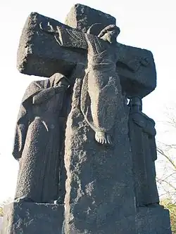 Der Zugang zum Friedhof erfolgt durch die Krypta. Auf der Krypta steht eine Kreuzigungsgruppe. Die einzelnen Figuren der Gruppe, Maria und Johannes, sind 3,30 m groß und wiegen jeweils sieben Tonnen. Im Innern der Krypta ist symbolisch die Statue eines Soldaten aufgebahrt, an der regelmäßig Kranzniederlegungen durch ausländische Staatsvertreter erfolgen.