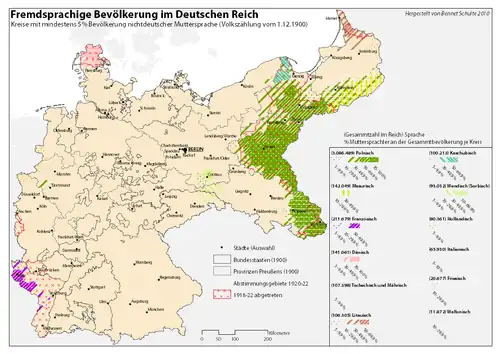Dem Kaiserreich gehörten 25 Bundesstaaten (Bundesglieder) – darunter die drei republikanisch verfassten Stadtstaaten Hamburg, Bremen und Lübeck – sowie das Reichsland Elsaß-Lothringen an. Das Reich war fast 50 Prozent größer als die heutige Bundesrepublik Deutschland und umfasste Gebiete, die heute zu Dänemark, Polen, Russland, Frankreich, Belgien, Litauen, Tschechien, den Niederlanden und Luxemburg gehören. Das Reich war mit 540.858 km² flächenmäßig nach Russland und Österreich-Ungarn der drittgrößte Staat Europas.