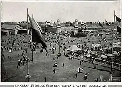 Als etwa 450 Meter lange Feststraße wurde die Thaerstraße ausgebaut, die das Areal in das Turngelände und in das sogenannte Vergnügungsviertel aufteilte.[17] Auf der rechten Seite der begrünten Feststraße befanden sich sechs Restaurants, am Ende ein Tanzplatz und das Hauptrestaurant.[18] Auf der linken Seite befanden sich in Haupteingangsnähe drei kleinere Turnzelte mit den Maßen 40 × 60 Meter sowie das große Wettturnzelt, welches 40 × 80 Meter groß war. Der zentral gelegene 69.020 Quadratmeter große Übungsplatz war insgesamt 340 Meter lang und 203 Meter breit. Er unterteilte sich in einen kleineren Geräteturnplatz (70 × 203 Meter, 14.210 Quadratmeter Fläche) und den großen Freiübungsplatz (270 × 203 Meter, 54.810 Quadratmeter Fläche) für maximal 17.264 Turner. Die vier umlaufenden Tribünen boten Platz für etwa 60.000 Zuschauer, darunter waren mehr als 23.000 nummerierte Sitzplätze. Zwischen dem Platz und den Tribünen waren Straßen für Einmärsche und zusätzliche Zuschauerkapazitäten angelegt. Unter den Tribünen waren unter anderem Garderoben, Geräteschuppen, Wasch- und Erfrischungsräume für die Turner und Verkaufsstände untergebracht.[20] Insgesamt war diese Anlage fast vier Mal so groß wie das Stockholmer Olympiastadion. Nördlich der großen Turnfläche war der 66.720 Quadratmeter große Probeturn- und Aufstellungsplatz zu finden, östlich noch zwei kleinere Spielplätze mit den jeweiligen Maßen 90 mal 60 Meter.[18]