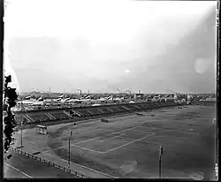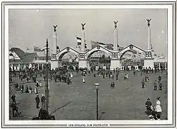 Der 54 Meter breite und mehrteilige Haupteingang mit 14 Kassen befand sich östlich des Eutritzscher Marktes, zwei Nebeneingänge an der Schönefelder Straße und am heutigen Werkstättenweg, Ecke Dieselstraße.[19] Rechts vom Haupteingang aus wurde ein Gebäude mit Räumlichkeiten für ein provisorisches Postamt mit Telegrafie- und Telefonmöglichkeiten, die Presseberichterstatter sowie den Pressausschuss errichtet, auf der linken Seite ein Gebäude für die wichtigsten Ausschüsse.[17]