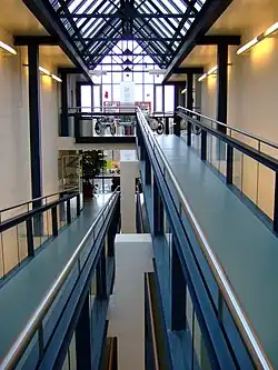 Das moderne Rampentreppenhaus verbindet die beiden historischen Gebäude