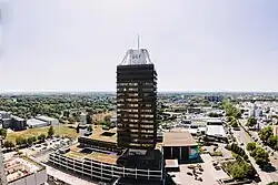 DLF-Gebäude. Im Hintergrund ist das Funkhaus am Raderberggürtel zu sehen. In dem blauen Büroturm und dem roten Studioturm war von 1980 bis 2003 die Deutsche Welle untergebracht.