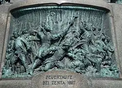 Die Schlacht bei Zenta wird mit dem Relief „Feuertaufe bei Zenta (1697)“ dargestellt. Diese Darstellung befindet sich auf der der Ringstraße zugewandten Vorderseite des Monuments.
