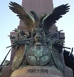 Darunter befindet sich mittig das Wappen der Hoch- und Deutschmeister. Links davon ist ein Porträt des ersten Regimentsinhabers, Herzog Franz Ludwig von der Pfalz, und rechts ein Bildnis des zum Zeitpunkt der Errichtung des Denkmals gegenwärtigen Inhabers, Erzherzog Eugen. Unter den beiden Bildern ist die Inschrift „1696 – 1896“ angebracht.