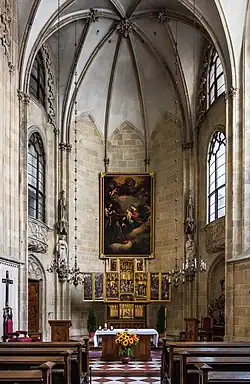 Im Zuge der Liturgiereform im Jahre 1986 wurde der Unterbau des Flügelaltares erneuert und ein Zelebrationsaltar und ein Ambo beigestellt. Der Cuspinianaltar zeigt den Stifter Johannes Cuspinian und seine beiden Gattinnen Agnes und Anna. Es gibt drei Grabdenkmäler zu Erasmus Graf Starhemberg, zu Guidobald Graf Starhemberg und zu Johann Josef Philipp Graf Harrach. Nach dem Tod des letzten österreichisch-ungarischen Monarchen Karl I./IV. hielten am 8. April 1922 die Ritter des Ordens vom Goldenen Vlies einen Trauergottesdienst für ihn in der Deutschordenskirche ab.[2]