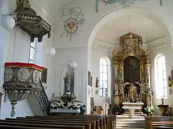 Am polygonen Kanzelkorpus sind in Form antiker Kameen die vier Evangelisten in Reliefbüsten und ohne Attribute dargestellt.[8] Auf dem Schalldeckel sind die zwei Gesetzestafeln, ein Kreuz und eine Vase angebracht. Auf der Kanzelbrüstung hat sich Franz Anwander aus Landsberg am Lech porträtiert, der 1788 alle Fassungen der Kirche besorgt hatte.[10] Das aus der Bauzeit der Kirche stammende runde Taufbecken auf kanneliertem Ständer steht im Chorraum rechts neben dem einfachen Chorgestühl. 1993 kamen ein Volksaltar und ein Ambo von Hans Kreuz aus Herrsching am Ammersee in den Altarraum.[10]