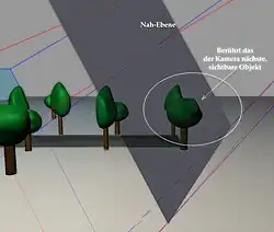 Die Sichtachsen einer idealen 3D-Kamera verlaufen parallel zueinander. Das hat zur Folge, dass die Projektionsebene () zwangsläufig nahe der Fernebene liegt. Zur Verschiebung der Projektionsebene muss das Bild beschnitten werden. Das verringert seine Breite und verändert damit die in der Berechnung festgelegte relative Deviation geringfügig. Die Formel muss dahingehend erweitert werden. In den Bildbeispielen tritt dieser Effekt nicht auf. Die Szenen wurden vom Computer berechnet und mit einer off-Axis-Projektion dargestellt. Es gibt optische Systeme die diese Projektion imitieren.