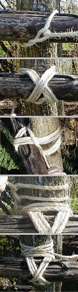 Das Seil wird mittels Webeleinenstek oder Zimmermannsstek an einem Balken angebunden. Dann folgen jeweils drei bis sechs Wicklungen über den stumpfen Winkel zwischen den beiden Balken, dann zwei bis vier Windungen über den spitzen Winkel. Anschließend wird der Bund noch durch Knebeln vor dem Verrutschen geschützt. Dazu folgen zwei Windungen quer zu den beiden vorherigen so, dass die zwei Balken voneinander weg gedrückt werden. Das lose Ende wird abschließend mit Webeleinenstek am Balken befestigt.
