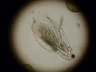 Der schmale Kopf besitzt keinen Schnabel und kein Haftorgan und ist scharf von der Rumpfschale abgesetzt. Das Komplexauge besitzt zahlreiche Kristalllinsen, aber kein Naupliusauge. Die erste Antenne ist abstehend und bei Weibchen klein, die zweite Antenne ist sehr groß und muskulös. Letztere besitzt Ausleger, welche ein Absinken verhindern. Es sind sechs Beinpaare vorhanden. Bei Männchen befindet sich das stielförmige, lange Kopulationsorgan hinter dem sechsten Beinpaar. Weibchen erreichen eine Größe von knapp einem Millimeter.