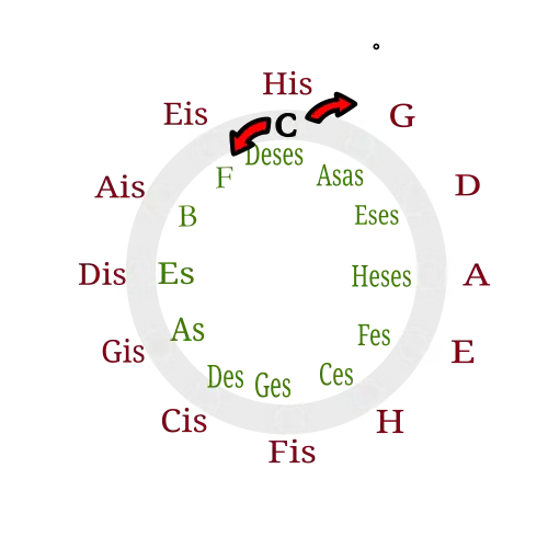 Eine der möglichen Herleitungen beruht auf Quintschritten im Quintenzirkel, man spricht auch von Quintenschichtung (oder Quintschichtung). Ausgehend von C gelangt man im Quintenzirkel bei einem Schritt abwärts (gegen den Uhrzeigersinn) zu F. Aufwärts (im Uhrzeigersinn) gelangt man nacheinander zu G, D, A, E, H (siehe Bild rechts). Das sind insgesamt alle Töne der C-Dur-Tonleiter.