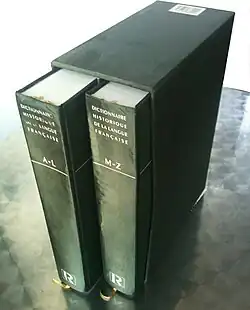 Das bedeutende vielbändige Französische Etymologische Wörterbuch von Walther von Wartburg ist selbst dem gebildeten Franzosen in dreierlei Hinsicht verschlossen. Es steht nur in den größten Bibliotheken, es ist auf Deutsch verfasst und es ist so angelegt, dass man Fachmann sein muss, um es benutzen zu können. In dieser Situation fühlte sich der gestandene Lexikograf Alain Rey herausgefordert, die Bedeutungsgeschichte jedes einzelnen Wortes dem gebildeten französischen Publikum, das sich traditionell dafür brennend interessiert, in verständlicher Form und nach dem Stand der Forschung zu erzählen, statt wie üblich in lexikografisch verklausulierter Form darzubieten.[1] Sein Wörterbuch Dictionnaire historique de la langue française, das 1992 in zwei Bänden auf 2304 eng bedruckten großformatigen Seiten erschien, war sofort ein Verkaufsschlager und erscheint derzeit bereits in 8. Auflage. Bei der Anfertigung konnte er sich auch auf den Reichtum an historischer Beschreibung im Grand Robert de la langue française stützen, was ebenso für die aufgenommene Idiomatik gilt.