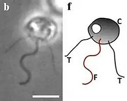 (b) Phasenkontrast-Aufnahme und (f) Schemazeichnung von Pteridomonas danica; C: Zelle, F: Geißel, T: Tentakel. Balken 5 μm.