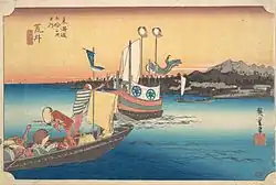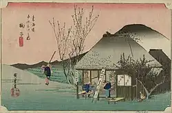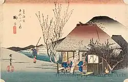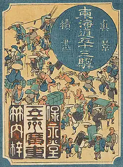 - 1835 in der von Takenouchi Magohachi produzierten Serie „Die 53 Stationen“ (Gojūsan tsugi no uchi, 五十三次之内). Die Blätter der Serie zeigen Schauspieler in Rollen aus dem im selben Jahr aufgeführten Kabuki-Stück „Die 53 Stationen während des Pflaumenfrühlings“ (Ume no haru gojūsan tsugi, 梅初春五十三駅). Sieben Drucke im ōban-Format sind bekannt und alle sieben haben ein kleines Kartuschenbild mit Abbildungen aus Hiroshiges Tōkaidō.[40]