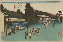 - ↑ Die zuerst veröffentlichten elf Drucke der gemeinsamen Herausgeberschaft der beiden Verleger waren: Nihonbashi 01, Shinagawa 02, Kawasaki 03, Hodogaya 05, Totsuka 06, Hiratsuka 08, Okitsu 18, Mariko 21, Fujieda 23, Nissaka 26 und Fukuroi 28. Der von Tsuruya Kiemon alleine herausgegebene Druck ist Okabe 22.