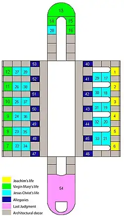 - ↑ Lage der Fresken in der Kirche. Die Beweinung Christi hat die Tafelnummer 36