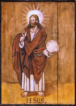 - Auf der rechten Seite neben der biblischen Geschichte (Nordseite) sind in einer Reihe Personen dargestellt (18 Bilder, Reihe 1, Zeile 1–18): Jesus Christus, die zwölf Apostel und die vier Evangelisten sowie Martin Luther.