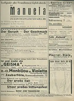 Die letzten beiden Seiten beinhalteten auch zahlreiche Veranstaltungshinweise und Anzeigen von lesbischen Lokalen, mehrheitlich aus Berlin. Treffen und Feste der sogenannten Damenklubs fanden auch im redaktionellen Teil Niederschlag, wo im Nachhinein darüber berichtet wurde. Diese Damenklubs waren ausgewiesen groß; beim 4. Stiftungsfest des Damenklubs „Violetta“ von Lotte Hahm etwa waren laut Bericht 350 Mitglieder anwesend.[1] Der Damenklub „Erato“, der in Die Freundin annoncierte und über dessen Klubtreffen dort auch berichtet wurde, mietete für seine Veranstaltungen Tanzsäle mit einem Fassungsvermögen von 600 Personen.[25]