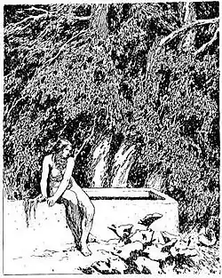 Das Bild der Gänsehirtin am Brunnen prägten die Illustrationen von Ignatius Taschner. Er schuf sein Illustrationsprogramm zu dem Märchen für die Jugendstilbuchreihe Gerlach’s Jugendbücherei[12]: Die Gänshirtinillustrationen umfassen zwei großformatige quadratische Farbbilder, vier kleinere Farbillustrationen und fünf Schwarz-Weiß-Vignetten von unterschiedlicher Größe. Die beiden quadratischen Hauptbilder thematisieren die zentralen Märchensituationen: 1.Der junge Prinz trägt die fröhliche Alte auf seinem Rücken und 2.Die Gänsehirtin-Prinzessin sitzt am Brunnenrand[13].