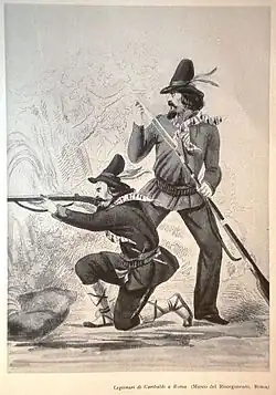 Am 30. April 1849 beaugenscheinigt General Garibaldi das Anrücken der Franzosen vom Turm der Villa Corsini aus. Ricarda Huch schreibt: „Er wußte und sah als geübter Feldherr, wie überlegen diese Truppen den seinigen waren, nicht nur durch die Zahl: sie waren erfahren, ausdauernd und tapfer...“[8] Die Franzosen greifen die Villa an. Montaldi wird umringt. Sein Säbel zerbricht bei der Abwehr der Übermacht. Montaldi fällt. Der Feind wird – auch dank des beherzten Vorpreschens der Bersaglieri unter Manara sowie der Reiterei unter Angelo Masina – zurückgeschlagen und flüchtet. Auf Befehl des Triumvirats darf Garibaldi die Franzosen nicht verfolgen und vernichten – die größte Fehlentscheidung der republikanischen Regierung, wie sich herausstellen wird. Mazzini und Armellini glauben, ihre neue Republik könne überleben, wenn sie sich mit Frankreich anfreunde. Der tapfere Montaldi wird beerdigt. Zuvor zählt Garibaldis Leibarzt Ripari an dem teuren Toten neunzehn Wunden. Manaras Bersaglieri bewähren sich auch Mitte Mai 1849 bei der Bekämpfung der Bourbonen in Velletri. In der Schlacht stürzt Garibaldi und zieht sich, unter seinem Pferde liegend, Quetschungen zu. Ende Mai geht es wieder gegen die Franzosen in Rom. Masina und weitere Offiziere Garibaldis fallen am 3. Juni bei Gegenangriffen beziehungsweise werden verwundet. Nino Bixio wird schwer verwundet. Nicht alle Soldaten der Freischar erscheinen als Helden. Als Garibaldi am 9. Juni 1849 eine nächtliche Erkundung in Richtung der französischen Vorposten anführt, flüchten die „besinnungslosen“ Feiglinge ohne jede Feindberührung. Am 13. Juni geht das Triumvirat auf die französische Forderung zur Übergabe Roms nicht ein. Das Bombardement beginnt. Täglich fallen knapp siebzig italienische Kämpfer. Oudinot bombt die Römische Republik in Grund und Boden. Wenn eine Bombe einschlägt, werfen sich die Soldaten blitzschnell hin. Garibaldi bleibt ruhig stehen, weil er meint, es treffe Liegende wie Stehende. Garibaldi sieht nur einen Ausweg – den rechtzeitigen Rückzug der Freischar aus Rom. Der Kampf könnte an anderer Stelle – zum Beispiel in den Bergen – fortgeführt werden. Die Triumvirn sind gegen vaterlandsloses Vagabundieren und fordern den Gegenangriff. Garibaldi sieht sich dazu außerstande. Am 3. Juni hatte er die Hälfte seiner fähigsten Leute verloren. Mazzini ist empört: „Verflucht das Volk, das nicht für sein Vaterland sterben kann!“[9] In der Nacht zum 22. Juni müssen die römischen Truppen ihre vorderste Verteidigungslinie räumen.