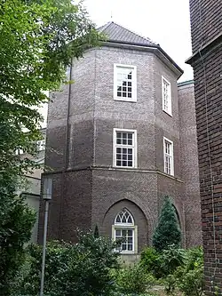 Am 26. Januar 1915 wurde das Gebäude Opfer eines Großfeuers. 1919 wurde ein Architektenwettbewerb für den Neubau ausgerichtet, bei dem der Bremer Architekt Heinz Stoffregen einen der insgesamt sechs ersten Preise gewann. Sein Entwurf sah unter anderem den Erhalt des gotischen Kreuzgangs vor, der bei dem Brand erhalten geblieben war, wurde jedoch nicht umgesetzt.[2] Die Ruine wurde 1925 abgetragen, dabei wurde auch der Kreuzgang zerstört.