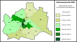 Bei der Nationalratswahl 2002 lagen die Grünen in Wien mit 15,1 % noch deutlicher über ihrem bundesweiten Ergebnis von 9,4 %. Die Grünen erreichten dabei in Wien knapp vor Vorarlberg erneut ihr bestes Bundesländerergebnis und konnten mit dem 7. Wiener Gemeindebezirk Neubau erstmals bei einer österreichweiten Wahl in einem Bezirk die relative Mehrheit erzielen.[21] Bei der daraufhinfolgenden Nationalratswahl 2006 steigerten die Grünen in Österreich ihren Stimmenanteil auf 11,0 %. Wien blieb dabei mit 17,4 % der stimmenstärkste Landeswahlkreis der Grünen. Diesmal erzielten die Grünen neben Neubau auch die relative Mehrheit in den Bezirken Mariahilf und Josefstadt, womit die Grünen erstmals auch in einem Regionalwahlkreis (Wien Innen-West) die relative Mehrheit erreichten.[22]