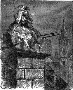 Oben angekommen, müssen sie sich erst einmal auf dem Schornsteinrand ausruhen. »Hoch über ihnen dehnt sich der Himmel mit seinen hellen Sternen, und tief unter ihnen liegen die dunklen Dächer der Stadt. Unendlich weit können sie schauen, unendlich weit in die große Welt. So hat sich die arme Hirtin das nicht vorgestellt. […] ›Das ist zu viel!‹ sagt sie, ›das kann ich nicht ertragen! Die Welt ist allzu groß!‹« Trotz der Warnung des Schornsteinfegers vor dem Chinesen und dem Ziegenbockbein bittet sie ihren Verlobten, sie wieder zurückzubegleiten, und so klettern sie mit viel Mühe wieder den Schornstein hinunter.