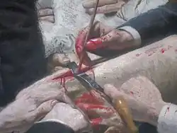 Gross behandelt im Bild eine Osteomyelitis des Oberschenkelknochens, das heißt, es wird nekröses Knochengewebe entfernt. In früheren Zeiten hätte diese Erkrankung zur Amputation der betroffenen Gliedmaße geführt. Im 19. Jahrhundert war jedoch eine konservative Behandlung, wie sie hier gezeigt wird, möglich.
