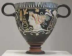 Die Ähnlichkeit mit den vielfarbigen Frauenporträts von der gegenüberliegenden Adriaseite auf schwarzem Hintergrund, die von pflanzlichen Motiven umgeben sind, ist – „typologisch wie stilistisch“ (Dieter Salzmann: Kieselmosaike)[25] – sehr deutlich.[16][26] „Das Mosaik von Dyrrachium steht in engster Beziehung zum Basler Krater des Ganymed-Malers von 330/20.“ (Dieter Salzmann: Kieselmosaike)[24] Auch unter den apulischen Vasen der Antikensammlung Berlin findet sich eine sehr ähnliche Bemalung eines Kraters.[27]