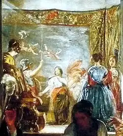 Die hintere Szene spielt sich offensichtlich in einer gehobenen Sphäre ab. Zwei Stufen führen zu einem alkovenartigen Raum, dessen Wände mit prächtigen Wandteppichen behängt sind und wo sich fünf weibliche Figuren in einem lockeren Kreis aufgestellt haben. Neben der in Blau gekleideten Dame auf der rechten Bildseite, die dem Betrachter den Rücken zukehrt, steht eine weitere junge Frau, die als einzige der fünf Figuren den Blick auf den Betrachter richtet. Auf der linken Seite steht neben einem Lehnstuhl, neben dem eine Viola da gamba abgestellt ist, eine weitere elegant gekleidete Frau, wie die beiden anderen offenbar Zuhörerin eines Dialogs zwischen der Behelmten und der Person im Zentrum der Szene. Die theaterhafte Wirkung der Szene wird sowohl durch die elegante und modische Kleidung der Damen betont als auch durch die dramatische Drohgeste der Figur mit dem griechischen Helm hervorgerufen und zusätzlich durch ein gleißend helles Licht, das verdeckt von links einfällt und alle fünf Personen in gleicher Weise erfasst.