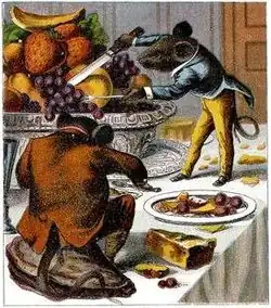 Auf einem prachtvollen Sessel im Speisesaal reicht die Stadtmaus ihrem Gast leckere Speisen, die diese verschlingt. Bevor die Landmaus ein Lob aussprechen kann, stürzt eine Schar Diener in den Raum und die beiden Mäuse fliehen.