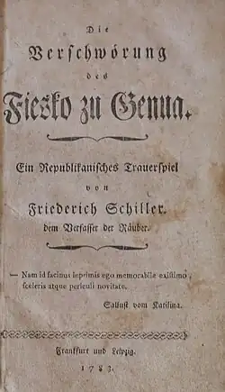 Die Verschwörung des Fiesco zu Genua ist das zweite vollendete Drama Friedrich Schillers. Er begann es nach der Premiere von Die Räuber 1782 und widmete es seinem Lehrer Jakob Friedrich von Abel. Das im Untertitel „Ein Republikanisches Trauerspiel“ genannte Stück, das sich an die historische Verschwörung des Giovanni Luigi de Fieschi gegen Andrea Doria in Genua des Frühjahrs 1547 anlehnt, wurde 1783 am kurkölnischen Bonner Hoftheater uraufgeführt.