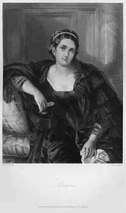 • Leonore, Fiescos Gemahlin, Dame von 18 Jahren, blass und schmächtig, fein und empfindsam, sehr anziehend, aber weniger blendend, im Gesicht schwärmerische Melancholie, schwarze Kleidung