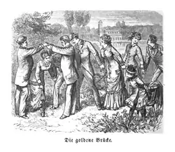 Die goldene Brücke, auch Brückenspiel genannt, ist ein zweiteiliges Singspiel[2] für Kinder, das Elemente des Laufspiels, des Fangspiels und des Ziehkampfspiels miteinander vereint. Weitere Namen sind Die steinerne Brücke,[3] Die goldene Pforte, Das goldene Tor oder Engel und Teufel.[4] Bei den Pennsylvaniadeutschen (Pfälzern) war das Spiel als Die holländisch’ Brück’ bekannt.[5]