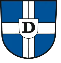 Die Blasonierung des Wappens lautet: In Blau ein durchgehendes, geschliffenes silbernes Kreuz, bewinkelt von vier silbernen Sternen und zentral belegt mit einem silbernen Herzschild, worin der schwarze lateinische Großbuchstabe D.