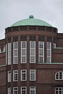 Es handelt sich um einen Stahlbetonskelettbau, der mit Klinkersteinen verblendet ist. Schumacher verbindet hier Merkmale der Hamburger Kontorhäuser mit seinem Streben nach einer hamburgischen Backsteinbauweise.