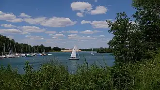 | Diersfordter Waldsee mit Segelhafen, vom Südufer aus gesehen (2020) | ||